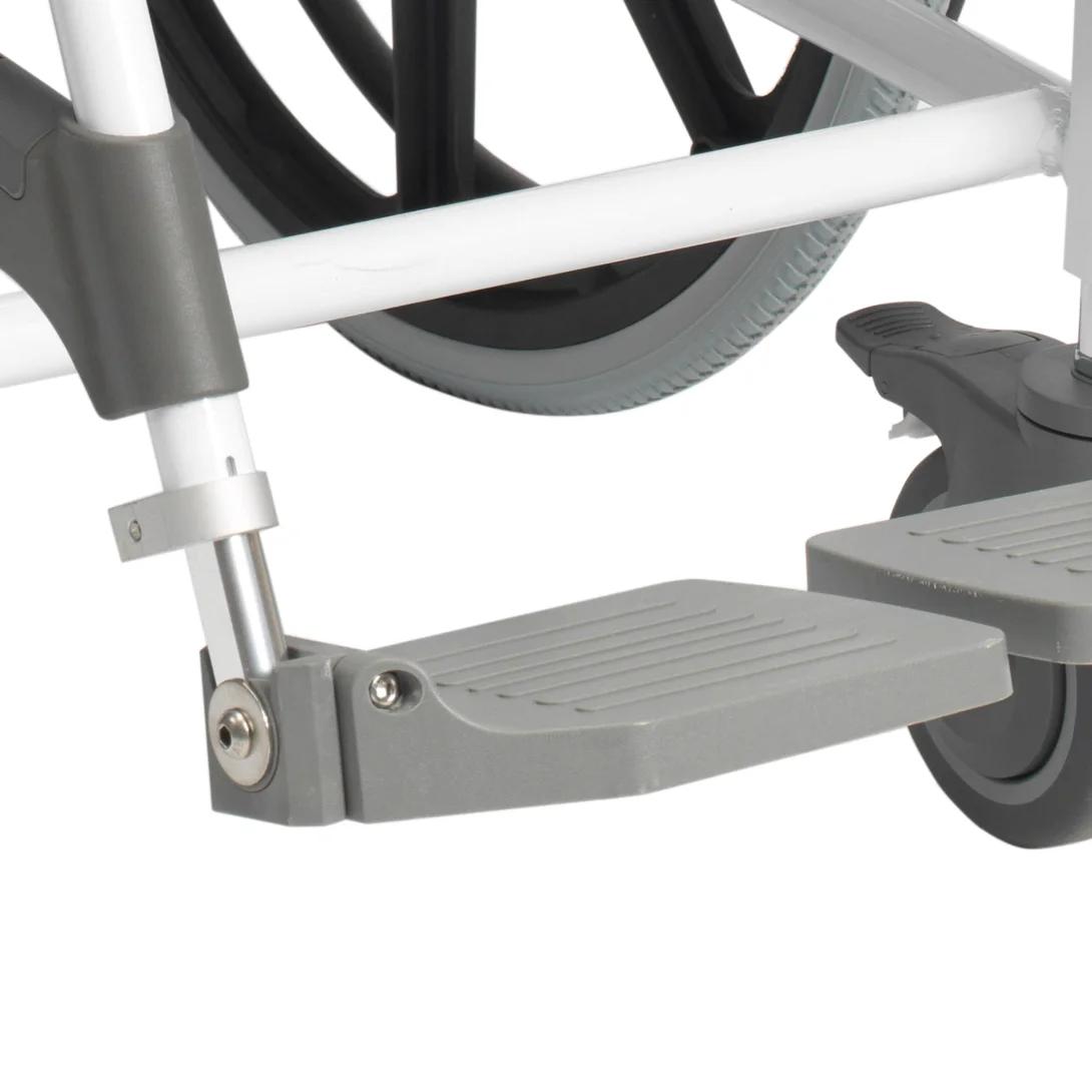 Der mitgelieferten Toiletteneimer des fahrbaren Toilettenstuhles mit Rädern ist nach hinten hin entnehmbar. Die schwenkbaren Fußstützen mit Fersenband sind stufenlos höhenverstellbar von 32,5 cm bis 50,0 und können abgenommen werden. Die Fußauflagen zum einfacheren Hinsetzen- und wieder Aufstehen können Sie hochklappen.