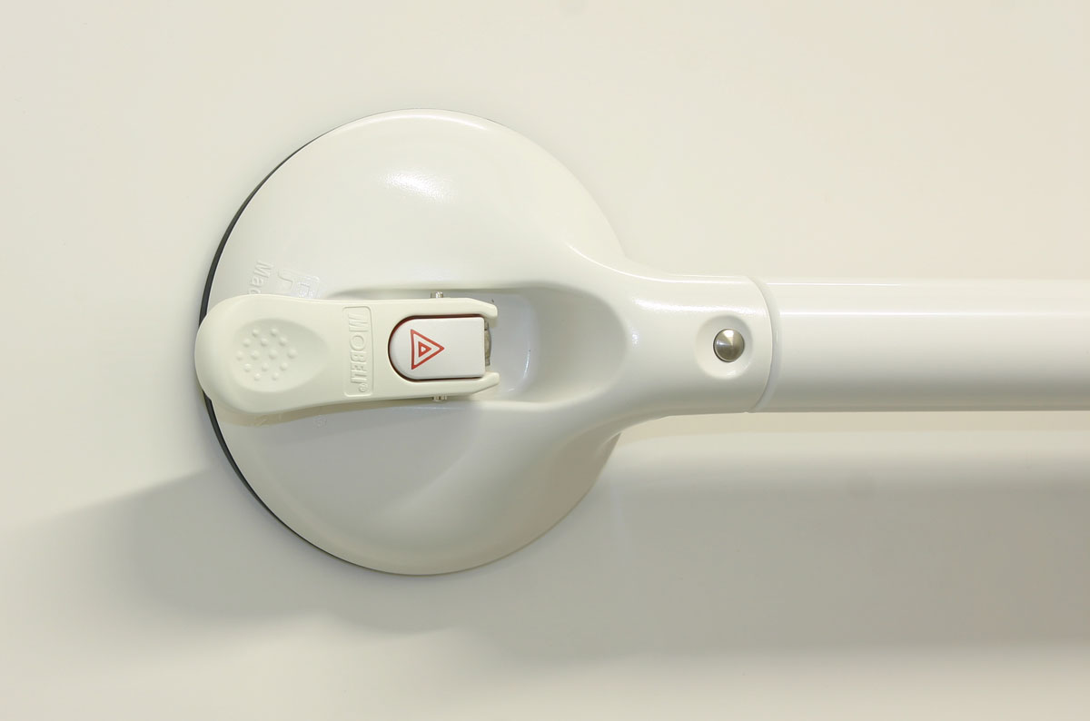 Ein mobiler 1-Hand-Haltegriff von Roth mobeli bietet sicheres Festhalten ohne Bohren und Schrauben bis zu einer Belastbarkeit von 105 kg Benutzergewicht. Als mobile Saughaltegriffe mit Sicherheitsanzeige sind die mobeli Roth 1-Handgriffe mit großen Saugnäpfen flexibel einsetzbare Bad-Haltegriffe in der Dusche, bei der Wanne oder neben der Toilette und so eine praktische Hilfe im Badezimmer zum sicheren Aufstehen, Stehen und Hinsetzen mit einer Greiflänge von 110 mm. Mobeli 1-Hand-Haltegriffe von Roth, geeignet hier für eine Hand, die sich nach Operationen und im Alltag von körperlich eingeschränkten oder älteren Menschen seit vielen Jahren bestens bewährt haben und immer weiterentwickelt wurden.
