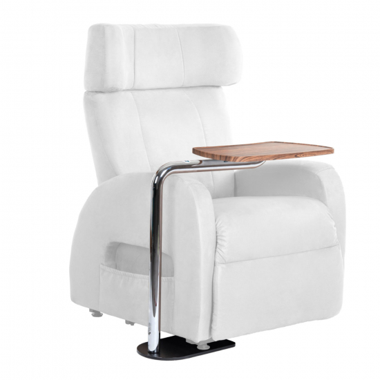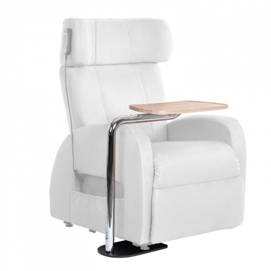 Ein praktischer Ablagetisch Tabula in heller oder dunkler Holzoptik und Edelstahl wird direkt am Sesselfuß befestigt und ist bis 20 kg belastbar. Der robuste Schwenktisch folgt den Bewegungen des Sessels während der Aufsteh-Phase. Er ist beidseitig montierbar, hat einen Schwenkradius von 70 cm und lässt sich in 3 Höhen einstellen. (voraussichtlich wieder verfügbar ab April 2026)