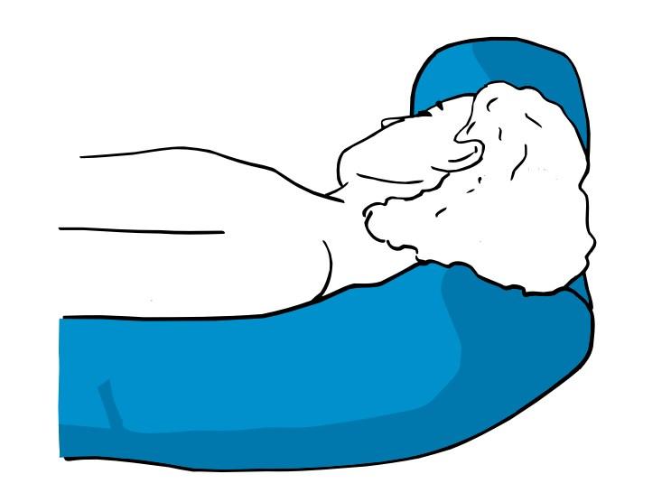 - In stützender Rückenlage des Patienten, zur Fixierung und Druckentlastung, hier wird das Halbmondkissen M direkt unter dem Kopf, Hals, Schultern und den oberen Extremitäten platziert