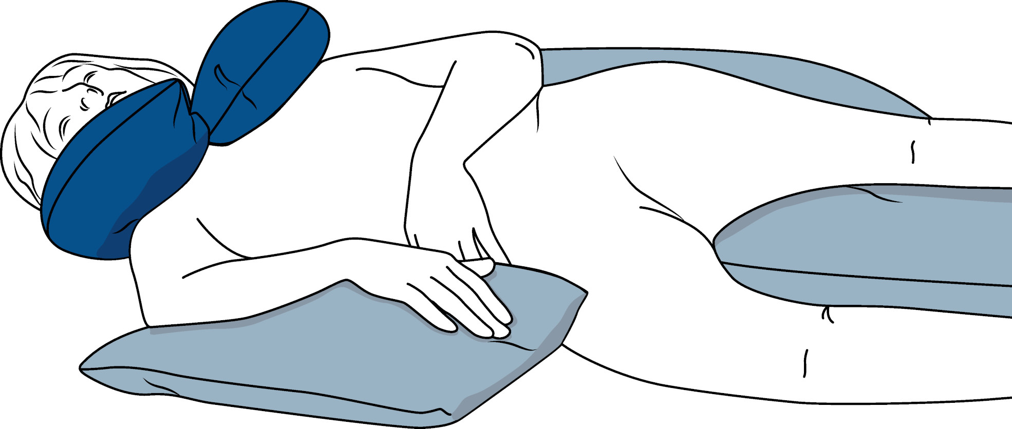- Ebenfalls kann es zur Unterfütterung der Unterschenkel und Freilagerung der Fersen oder bei der Platzierung unter den Oberschenkeln mit der offenen Seite des Lagerungskissens in Richtung Kopf zur Entlastung des Sakralbereiches durch partielle Freilagerung angewendet werden.